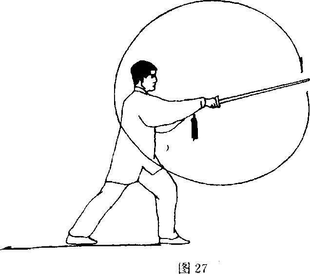 (1)接上势,左脚后撤半步,右脚不变;同时右手持剑以腕 关节为轴,立刃由前向后经身体左侧再向前立圆抡转一周,剑尖 向前,高与肩平;左剑指附于右腕;目视剑尖(图27)。