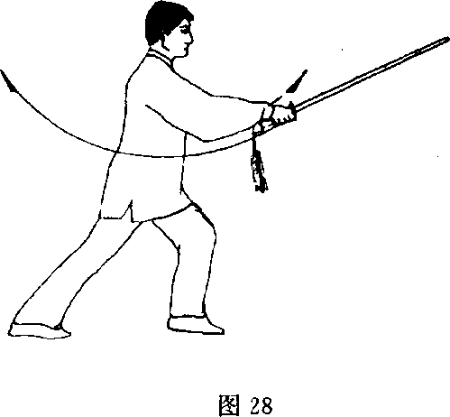 (2) '右脚向后退一步,左脚不变;同时右手持剑以腕关节为 轴,立刃由前向后经身右侧再向前立圆抡转一周,剑尖向前,高 与肩平;左剑指附于右腕;目视剑尖(图28)。