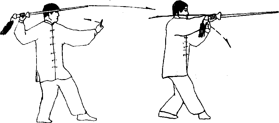 (3) 身体重心移至右腿;同时上体向右转;右手持剑小臂内 旋,,屈肘立刃回抽并反举至头部右侧,剑尖向前,高略低于头;左 剑指随之前伸,指尖向前,手心向下;目视剑指(图29)。