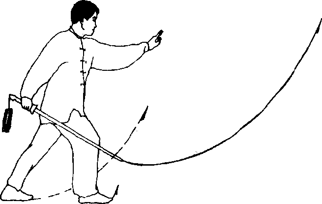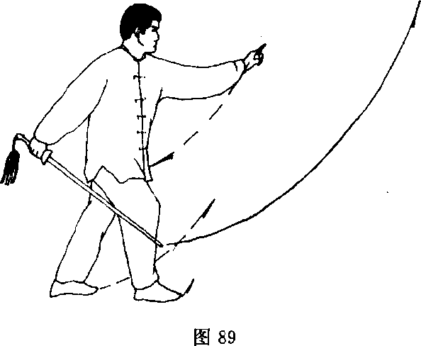 (1) 接上势,右脚略向左活步;上体右转;同时右手持剑由 前向后向下回抽至右胯旁,剑尖向前下方;左剑指由后向下向前 伸指,高与肩平;目视剑指(图89)。