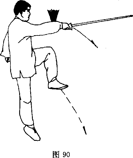 (2) 上体左转;左腿屈膝上摆,右脚随之蹬地跳起;同时右 手持剑立刃前摆上提,剑尖向前,高与肩平;左剑指屈肘下落至 身体左侧,手心向下,指尖向前;目视剑尖(图90).