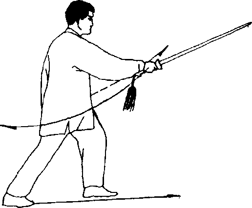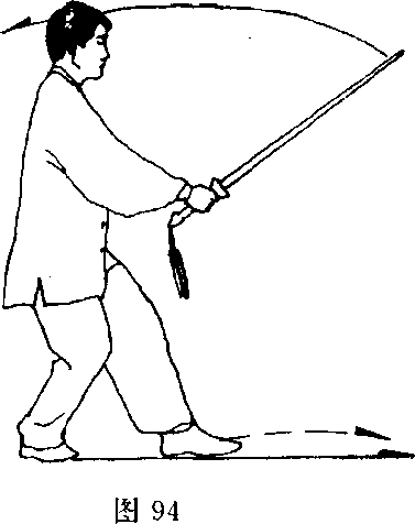 (6) 右脚、左脚依次落地成拗三体式步;同时右手持剑沉腕 立刃下压,剑尖高与肩平;左剑指仍附于右腕;目视剑尖(图 94)。