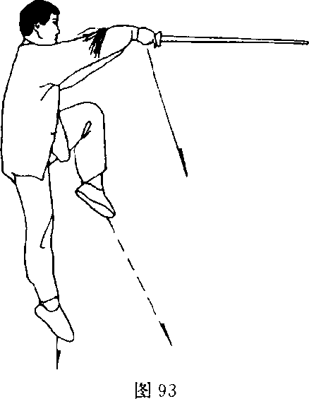 (5) 左腿屈膝向前上方提摆,右脚随之向前上方跳起;同时 右手持剑立刃前摆上提,剑尖向前,高与肩平;左剑指屈肘附于 右腕;目视剑尖(图93)。