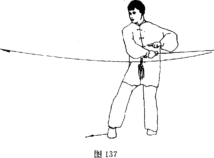 (2)右脚向前上半步成弓步;同时上体向右拧转;右手持剑 向右前方横崩,剑尖向前略高于肩;左剑指随之向左分开,手心 向下;目视剑尖(图138)。