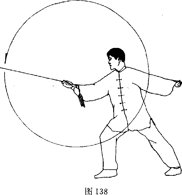 (1) 接上势,右手持剑在体前立圆抡转一周;目视剑尖(图 139)。