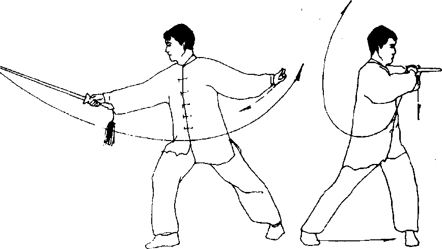 (4) 右剑指经右向下收至身体右侧;头向右转;目平视前方 (图142九
