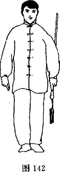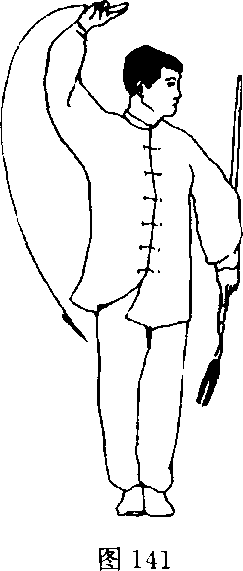 (3) 右脚向左脚并步,两腿直立;同时上体向右拧转;右手 变指向下经右再向上甩腕亮指;左手持剑自然下垂;头向左甩转, 目平视左前方(图141)。