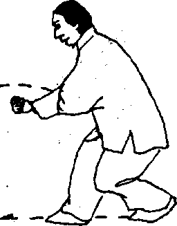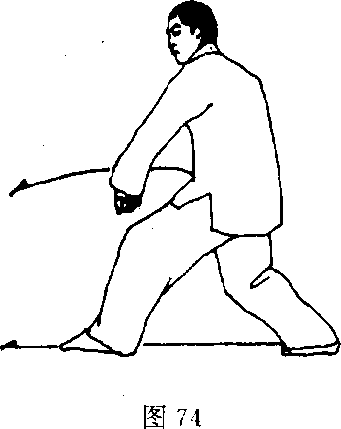 接上势,右廊向左脚前上一步,足尖外摆两腿屈蹲成右歇步; 同时右掌变拳,右臂外旋经腹前由左掌背上向前下冲击,掌心斜 向前,左掌变拳内收停于腹前右肘下;目视前下方(图75)。