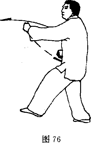 接上势,左脚前上一步,右腿后蹬微屈成三体势步;同时左 臂由下向前,向上外旋横拨,拳心斜向上,高与腰平,右拳回撤, 臂内旋,拳心翻转向下停于右腹前;目视前方(图76)。