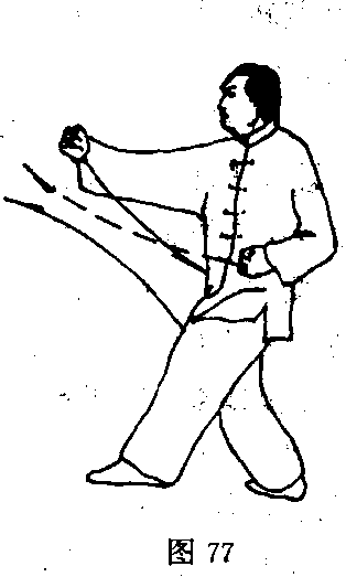 接上势,两脚不动,右拳由腰部向前冲出,拳眼向上,力达 拳面;左拳收回左腹前,拳心向上;目视左拳(图77)or