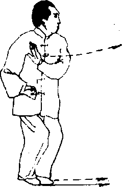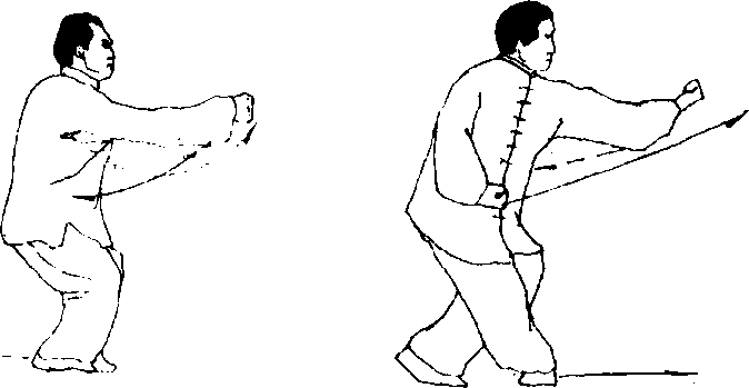(1) 上动略停,左脚前进半步,右脚随即跟进,置于左脚弓内 侧稍后一点,两腿屈膝微蹲;同时两掌变拳,右拳经左拳虎口处 向前直臂前冲,拳眼向上;目视右拳(图15)。