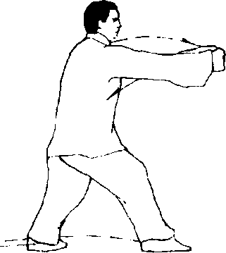 (3) 右脚向右前方上一步,左脚随之跟进半步,两腿屈膝微蹲