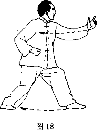 (1) 接上势,右脚向后撒一步,身体随之右转,同时右拳回收 至右腹侧,拳心向上,左拳变龟形掌,向外向前上方划弧至体前, 臂微屈,掌高与臂平,掌心向里;目视左掌(图18)。