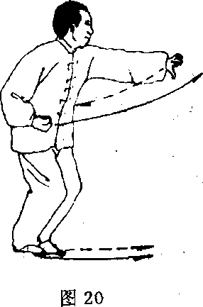 同时左龟形掌小臂内旋向前撑掌,掌心向前,高不过眉,力达掌 外缘,右拳不变;目视左手(图20)。