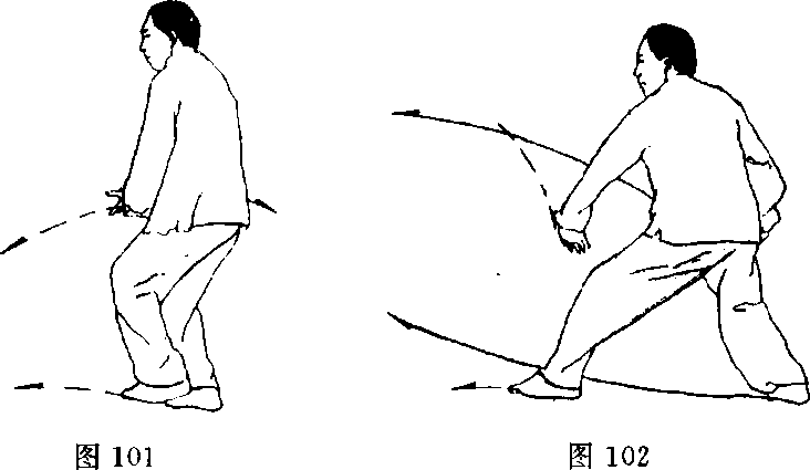 (2)上体略右转,左脚向前上一步,两腿屈膝半蹲成半马步; 同时两臂微向上举至胸前,十字交叉,掌心向上,续而两臂内旋, 使两掌心翻转向下,并向左右两侧屈臂外撑,两掌置于两膝上方, 掌心斜向下,掌指向内、目视左前方(图102)。