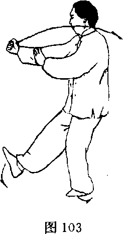 向上,高与胸齐,左掌向上,立掌扶于右小臂内侧,掌心向里;目 视右拳(图103) o