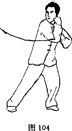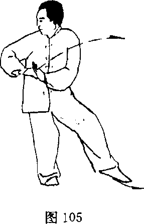 (1) 接上势,上体向左转,右脚落地,脚尖尽力内扣,左脚外 摆;同时重心移至右腿,右拳小臂外旋屈肘内收,停于左胸侧,拳 心向内,左掌仍扶于右拳小臂内侧;目视右侧(图104)o