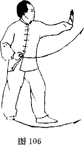 ,(1)接上势,上体左转,左脚向前方弧形上步,脚尖外摆,右 腿直立,同时左掌由后向左上方弧形摆掌,臂微屈,掌心向前,呈 抓握状,右拳拳心向上收抱于右腰侧;目视左掌(图106) o