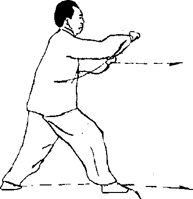 左脚进步外摆与左手抓握同时完成;右拳弧形贯拳,力点在 拳面,要与右脚上步同时完成。笔