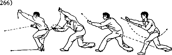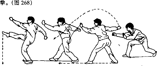 (2) 向左转腰拧胯调膀,身向前探。右拳随着转腰探身从左 腕上方直臂向前上方冲出,拳面朝前,拳心朝下,高与眉平;同 时,左拳屈肘向后右方划弧收到右胸前,拳面朝前,拳心朝下,肘 尖朝左下方。目视右拳。(图267)