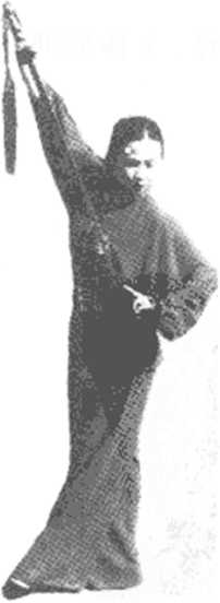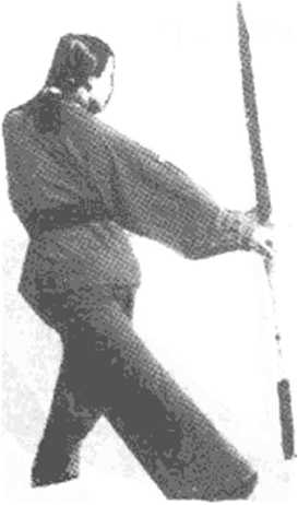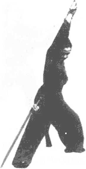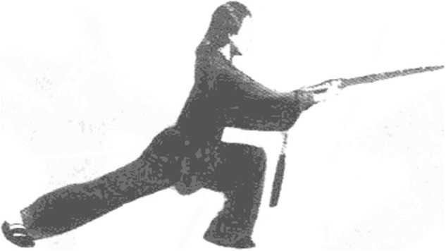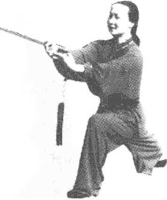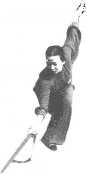 1. 体转正(I),略前倾,两腿屈膝半蹲,右手持剑右撩,左手 逆时针方向划孤(图7- 1),体左转270度,带剑平抹。