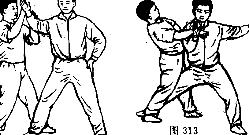 甲用掌穿乙胸部,乙迅速用左臂搂压,右掌从左肘内向上 穿出,击甲中线要害部位。如面部、喉部、心窝(剑突稍下)、胃 部。(图314、315)接主动不停,甲推乙臂,乙使甲劲落空,同时 用左手压甲双手后,乙及时用右掌穿击。