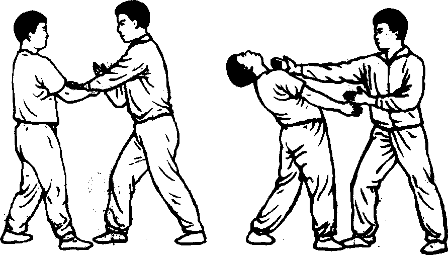 乙用臂在胸前划弧,使甲劲落空时要裹肘靠肩一气呵成。 乙手臂要随裆部转动而划弧,方可奏效,使甲不会过早的觉 察,以便自动进入圈套。