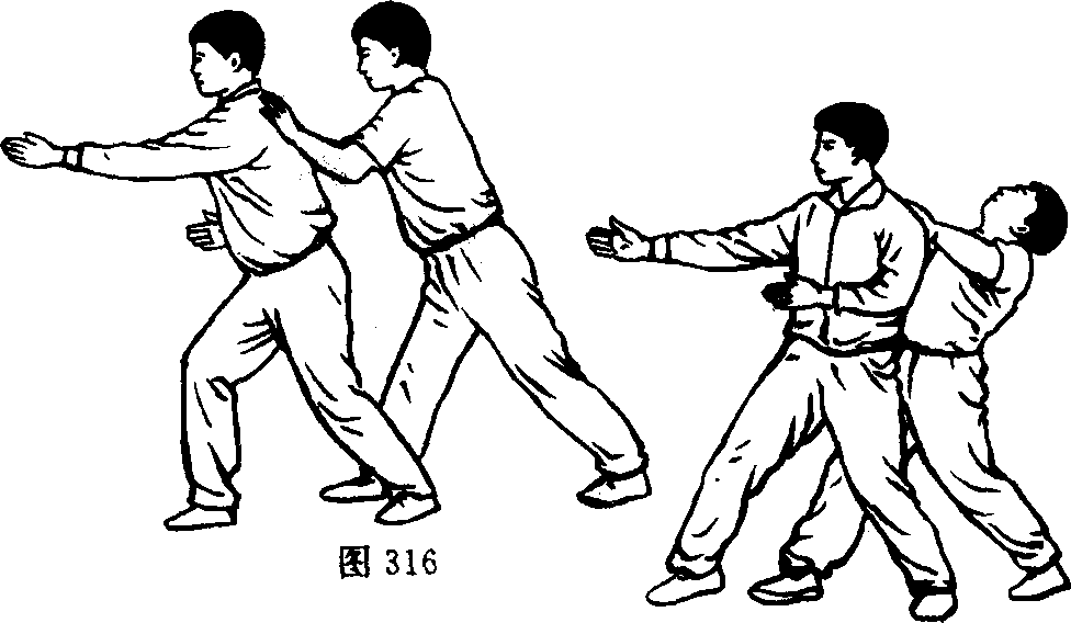 甲如在乙背后推击乙背,乙左肩顺甲劲向前稍送,使甲劲 落空,随甲抽手回劲之际,乙左脚后插,弓背打靠。(图316、