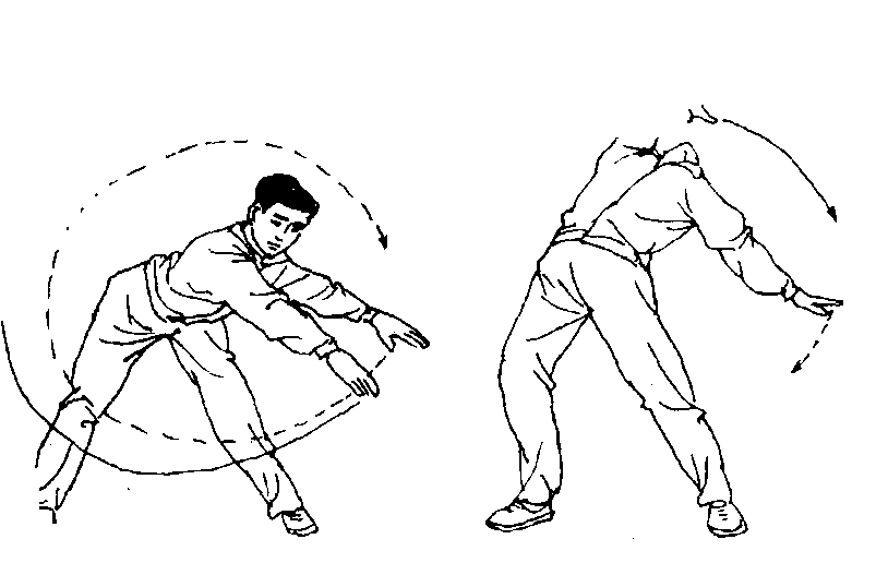 (1)两脚分开站立,两臂向上举起,然后上体前俯至上体 和手臂与地面平行;随之做由前、向左、向后、向右、再向前的 平行绕环摆动,即涮腰。初学者可将涮腰的一周旋转分四段完 成,以体会涮腰时上体所应经过的空间方位。
