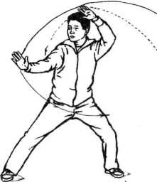 2- 右掌向上划弧旋腕,掌心斜向上反掌,向上托并向右牵引, 右臂如弯弓,身向右旋转,左掌徐徐向前搠出,伸直,臂稍屈,肘 下垂,立掌向北,眼视左掌前方。