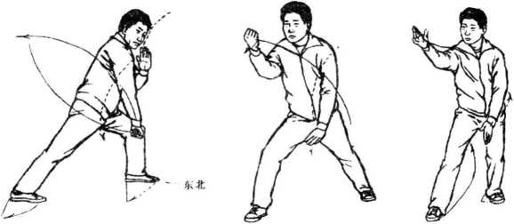 3. 两脚磨转向东、稍偏东南,由左弓步蹬腿转腰向东南时变