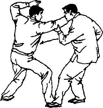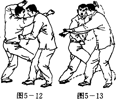 1 .甲含胸吞身;同时,左掌向右搬拦乙右肘;右掌屈肘收 至腹前,手腕下塌,掌指朝前。乙右掌变拳外旋,向左云领,避 开甲的搬拦动作(图5