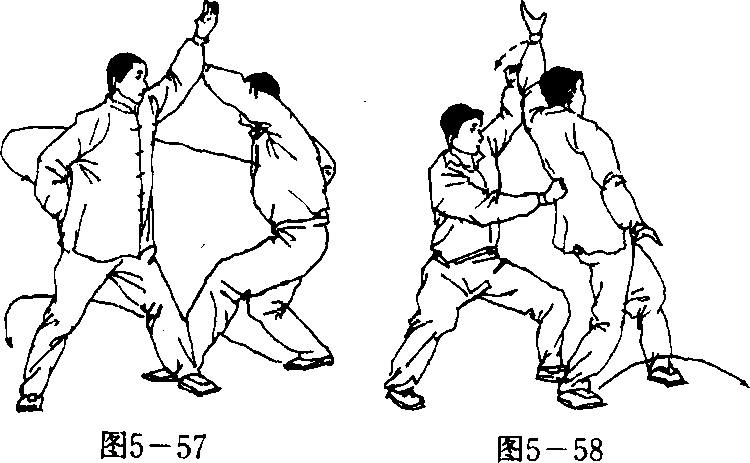 接上动。乙左手由下经甲左前臂内侧,向上挑领至头 左斜上方,同时左脚尖外摆;右掌下按,掌指朝前(图5—57)。