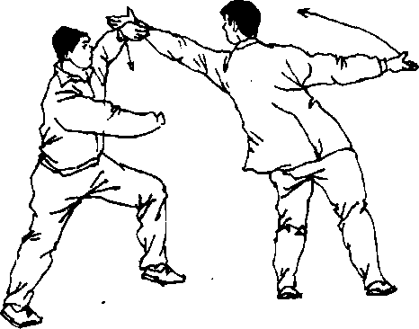 4 .上动不停。甲左前臂按压乙左前臂至水平部位;同时 向左翻身转体90。(即乌龙翻身);目视对方(图5—60)。
