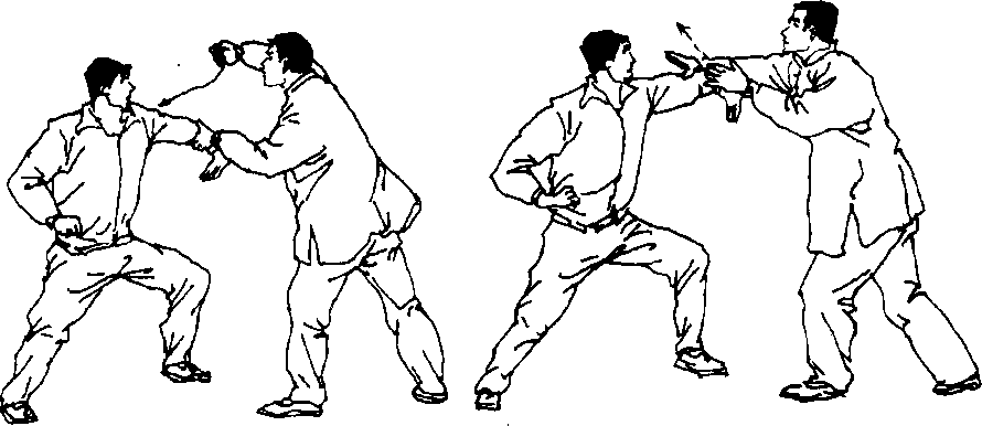 3 .甲右脚向前进步成右虚步,闪开乙右冲拳,左前臂由 上向下按压乙左前臂(图5-59)o