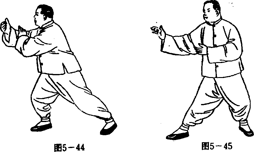 1. 接上势,右拳变掌,两掌随腰腿向右向内,再向左向下 顺时针绕两个立圆。右一脚前上一步,右膝前屈,重心前移,左 腿渐渐伸直,成右弓步5同时,右小臂随势向前往上糊起,左手 贴于右小臂内侧前推,至与胸上部齐,右掌心向后,左掌心向 前。目视前方。(图5 —44)(此为棚势)