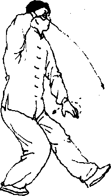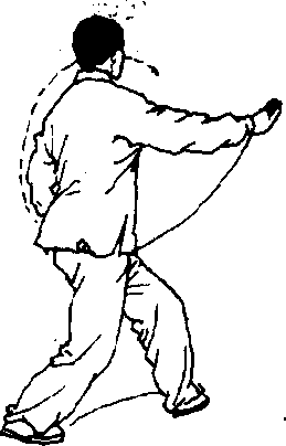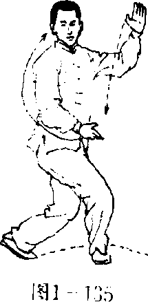 ①左腿屈膝,右腿屈 收,右脚前落,脚尖外撇, 上体右转,重心前移;两前 臂外旋,左掌向上、向右划 弧,掌心转向右,右掌翻转 下落至腰间,掌心向上;头 随上体转动(图1—135)。