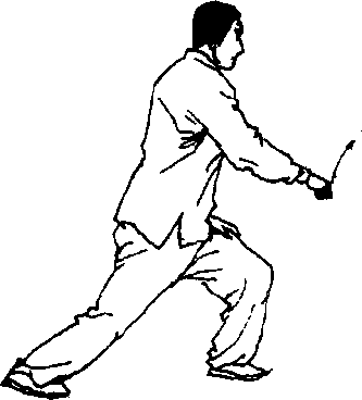 ③上体左转,稍向前 俯身,重心前移,血左弓 步;右拳向前下方打出,高 与腹平,拳面向前下方,拳 眼向左,左拳自左膝上方 搂过,按于左胯旁;目视右 拳(图 1—137)。