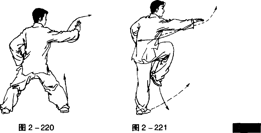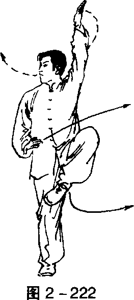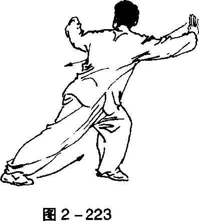 第 S八 极 * 更 宴第 S八 极 * 更 宴X 委 路X 委 路落右脚上左脚,提左膝, 左转体180。;左臂由右臂上侧 向上穿起,掌心朝里;右手后拉 置于左肋侧,掌心朝下,右摆 头。目视右侧(图2-222)。