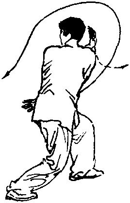 右脚起动,左转体,双脚碾动成马步;右手下垂向前弹出,左