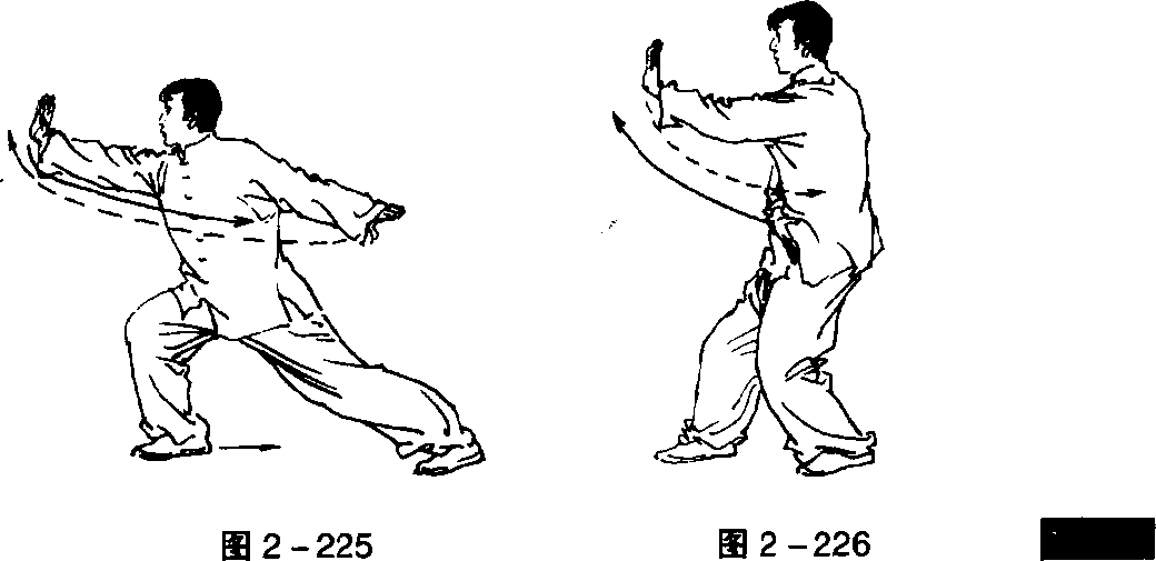 右转体成右弓步;右臂右抡平置于胸前;身体后坐成虚步, 右手垂落于左肋侧,左掌向前平击出c目视左手(图2-225、图 2 -226)c