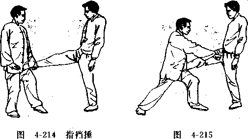 (-)搂挡防腿击裆甲方用右弹腿弹击乙方裆部,乙方用左手由里向外搂挡 (图4-214)随即用右拳攻击甲方裆部(图4-215)。(二)搂挡防拳击裆甲方用右冲拳攻击乙方胸部,乙方用左手由里向外搂挡, 随即用右拳还击甲方裆部(图4-216)。