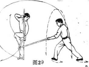 乙当甲竖棍拦堵棍头 时,即左手持棍上拾,向 右、向上、向左、向下,/ 棍头划逆时针圈,斜劈甲I 之左腿。同时右手握棍根\ 往下、往右,按于右腰 (图29 ) o