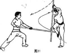 甲当乙以棍根粘住棍头 按地时,即右手抽棍往回, 左手接住棍腰。同时上左步 成左弓步,以棍头戳点乙之 右腿(图31 )。