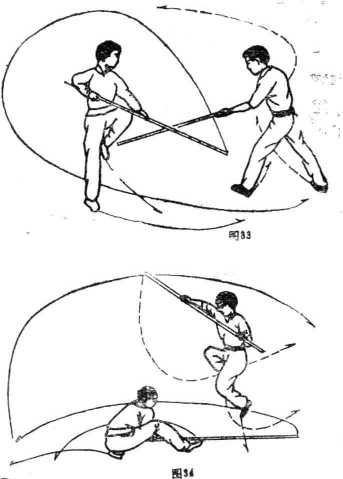 甲当乙棍击左足 踝时,提左膝让过。 同时继续将乙根头粘 住绞开(图33 )。