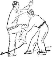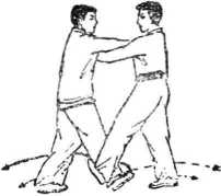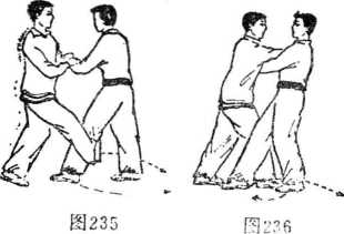 甲用拉肘踢脚,乙如提起左足后退时,甲左手仍采住乙 左腕,右足往左前盖步,踏乙右足外别住,右臂由乙右臂上 前伸,以右肩、身前靠,使乙往右后跌倒(图236 )。