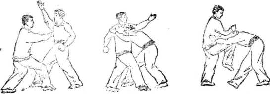 注意:采腕、拉肘与勾踢,必须迅速、同时进行。勾踢 时必须站稳。