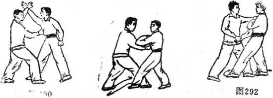 甲左手穿乙右手里侧上挑,同时石足上步插乙裆内成右 弓步,右拳击乙胸部(图290 ),