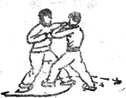 乙当甲右拳击胸时,速含胸、撤回右步、同时以右手穿 甲右拳外侧,反掌拿住甲右腕,随即上左步,插甲右足外, 向右转腰。抬右臂,横肘压住甲右上臂(图291 ),