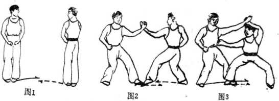 注意:头往上顶,精神提起;全身放松,气沉丹田。目 光对视,随时注意对方的动作、意图。